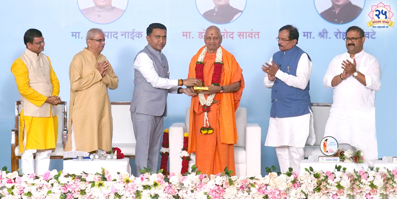 देवाला महत्त्व दिले, तर धर्म जागृत राहिल आणि धर्म जागृत राहिला तर देश जागृत राहिल. यासाठी गोवा सरकार देव, देश आणि धर्म रक्षणाचे कार्यासाठी कटीबद्ध आहे. सनातन संस्थेने कठीण प्रसांगांना सामोरे जाऊन आज देशभरात भरीव असे कार्य केले आहे. सनातन संस्थेचा गोव्यातील रामनाथी येथील आश्रमातून हिंदु धर्माचे रक्षणाचे महत्त्वाचे कार्य चालते. सनातन संस्थेचा ‘सनातन प्रभात’ हे नियतकालिक हिंदूंवर देश आणि विदेशात होत असलेल्या अत्याचार, तसेच हिंदू करत असलेले चांगले कार्य याची निरंतर माहिती देऊन हिंदुत्वाच्या जागृतीचे कार्य करत आहे. प.पू. गोविंददेव गिरी महाराज यांच्या सारख्या अनेक राष्ट्रसंतांमुळे भारतात देव, देश आणि धर्म रक्षणाचे कार्य चालत आहे, असे गोव्याचे मुख्यमंत्री श्री. प्रमोद सावंत यांनी या प्रसंगी सांगितले.