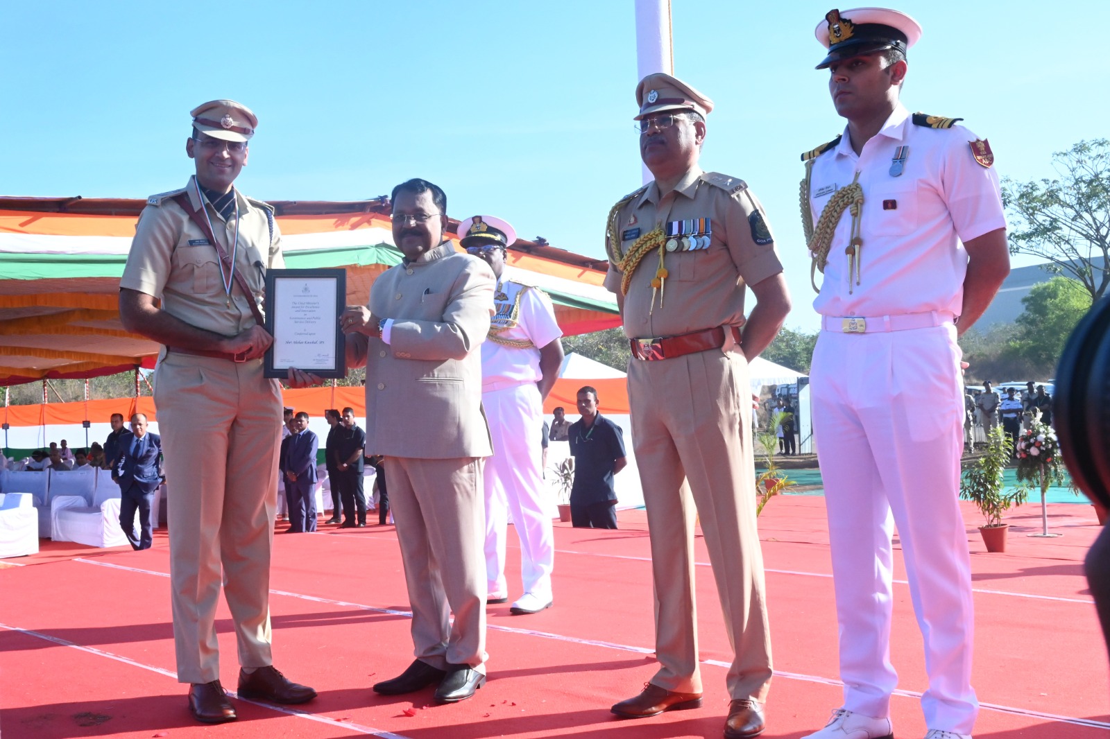 यावेळी उत्कृष्ट प्रशासकीय सेवेसाठी राज्यपालांच्याहस्ते उच्च शिक्षण सचिव प्रसाद लोलयेकर, पोलीस अधिक्षक, अक्षत कौशल आणि प्रधान मुख्य वनपाल, प्रवीण कुमार राघव यांना मुख्यमंत्री पुरस्कार’ प्रदान करण्यात आला.