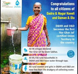 दादरा-नगर हवेली आणि दमण-दीव ठरला ‘हर घर जल’ प्रमाणपत्र प्राप्त पहिला केंद्रशासित प्रदेश गोव्यातील सर्व 2.63 लाख ग्रामीण घरांमध्ये तसेच दादरा-नगर हवेली आणि दमण-दीव मधील 85,156...