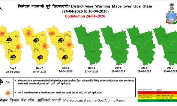 गोवा खबर : गोवा हवामान खात्याने (Meteorological Centre Goa, Altinho Panaji) २४ ते ३० एप्रिल २०२६ या कालावधीसाठी जिल्हानिहाय तापमान...
